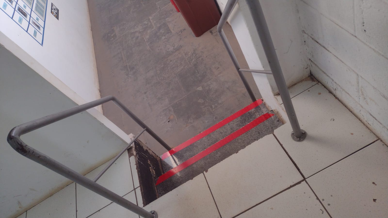 Escada de acesso ao escritório PCM com corrimão da escada bamba. Solicitado a liderança PCM o aperto dos parafusos.