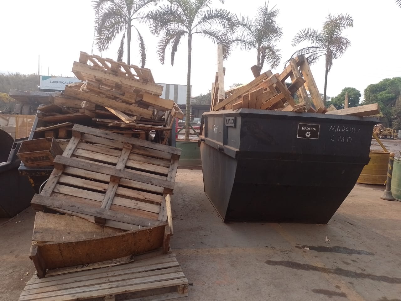 Caçamba de madeiras com acumulo de material com pregos exposto e risco de queda em pessoas próximo ao caminho seguro
