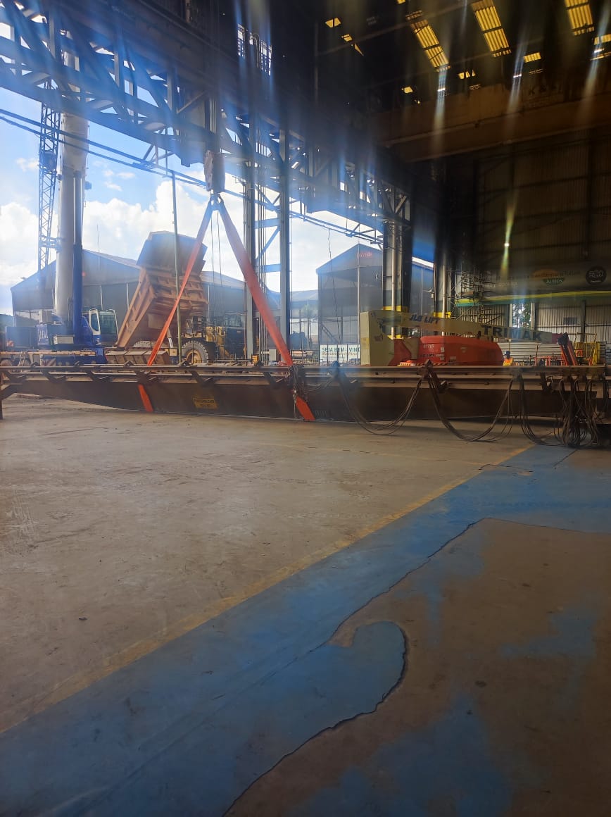 Descumprimento do plano de trabalho da desmontagem da ponte rolante, utilizando somente quebras quinas com aparatos de cinta. Realizada a interrupção da atividade com a peça no piso e reunida a turma. Nós próximos içamentos, foram realizadas a soldagem de quebra quinas.