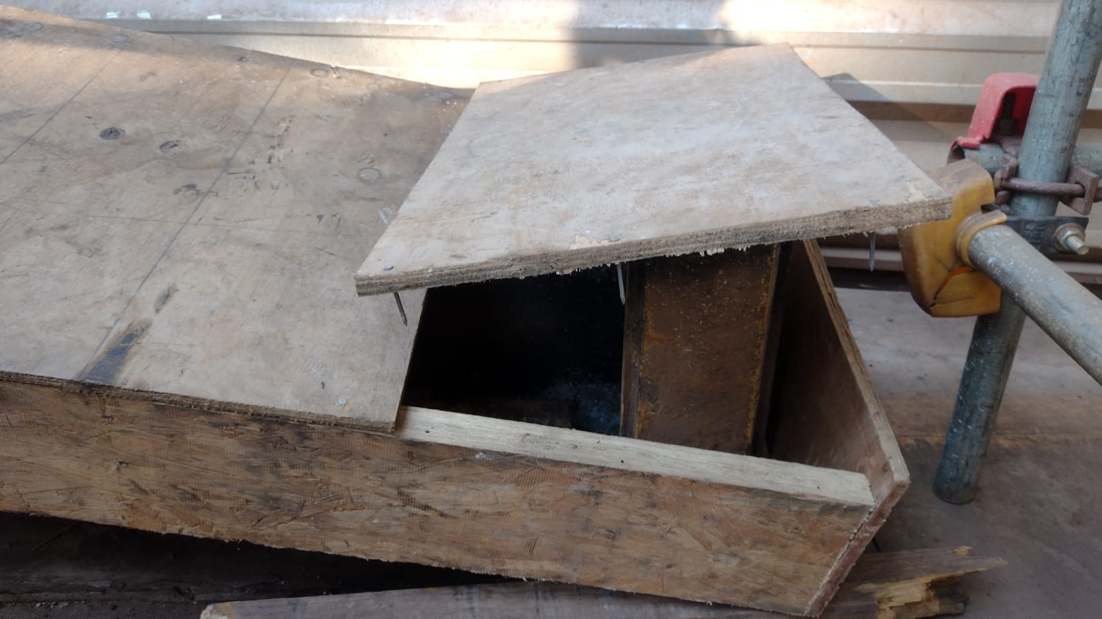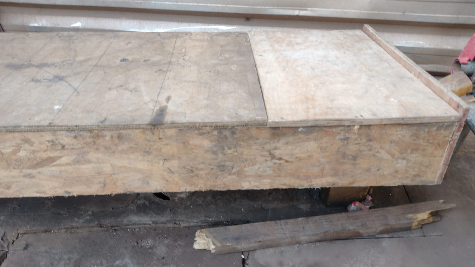 A madeira da caixa de proteção da coluna estava quebrada, com os pregos expostos com risco de perfuração nas mãos. Foi feita uma reforma na caixa de proteção.