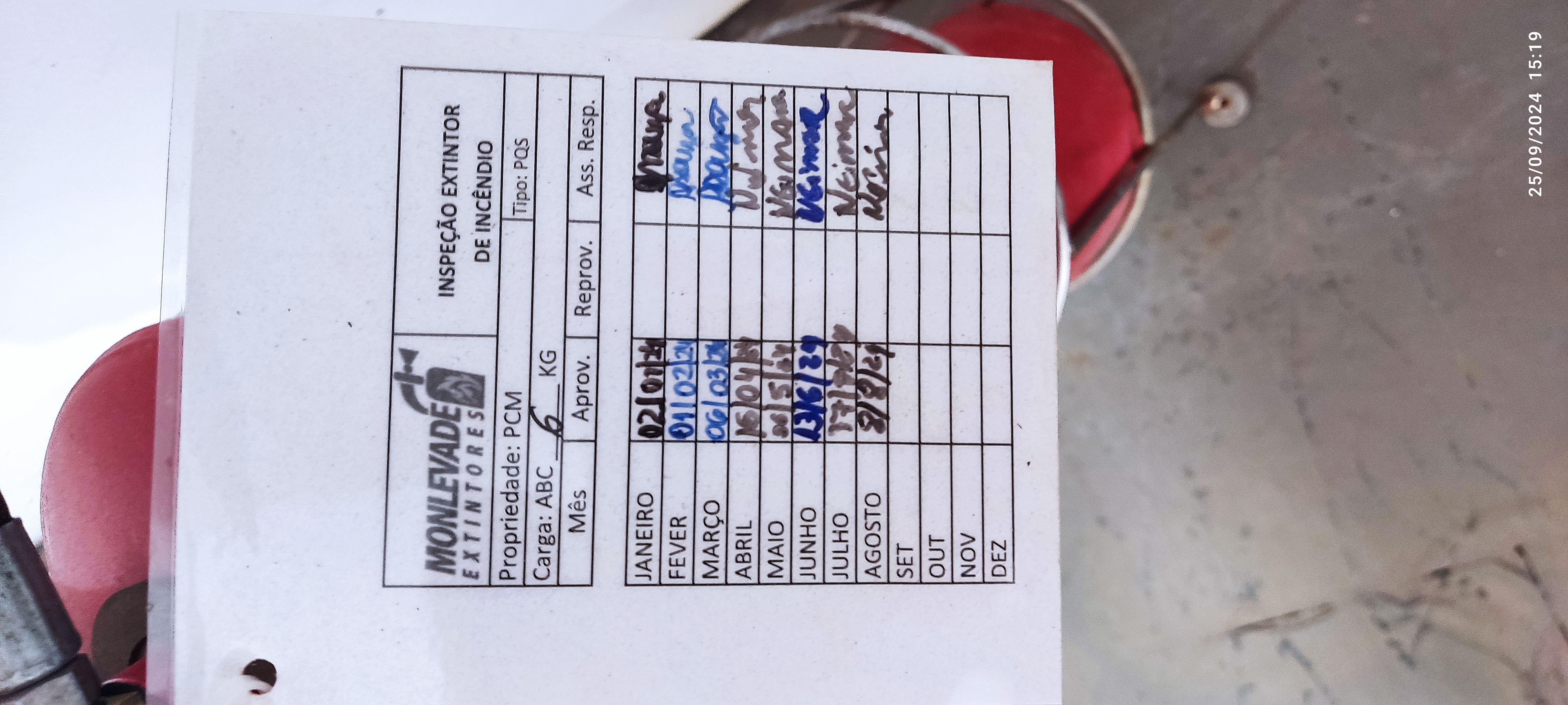 Extintor de incêndio dentro da área de vivência, sem a realização da inspeção do mês.