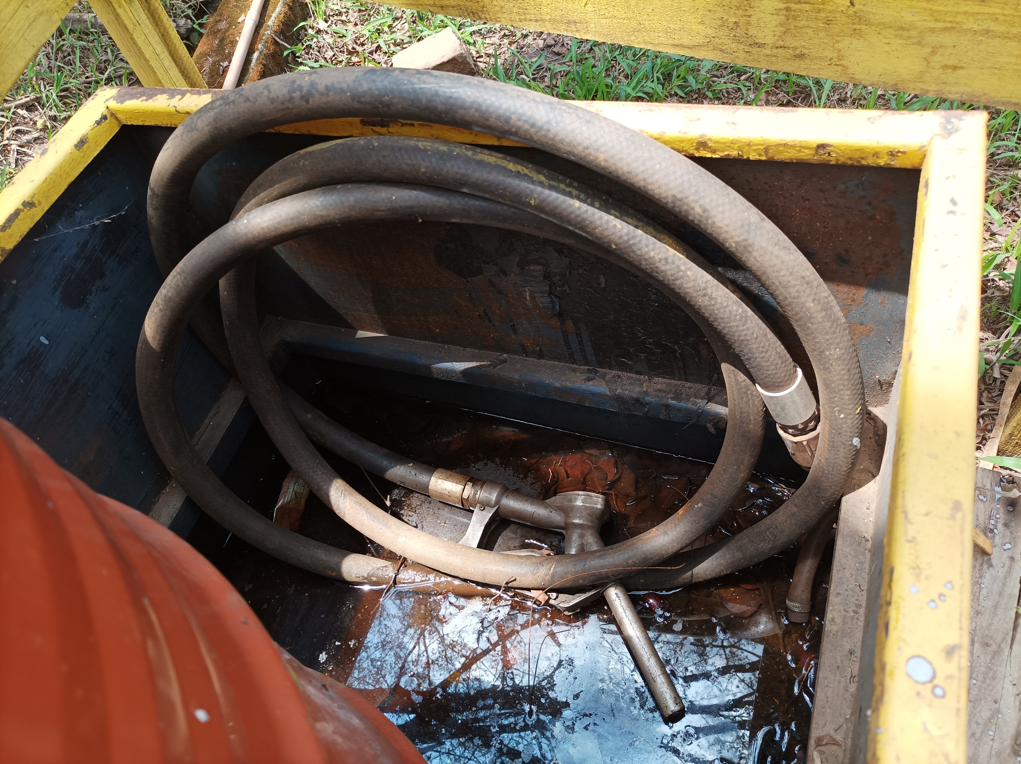 Descarte de água parada dentro de caixa de metal, eliminando possíveis focos de dengue.
