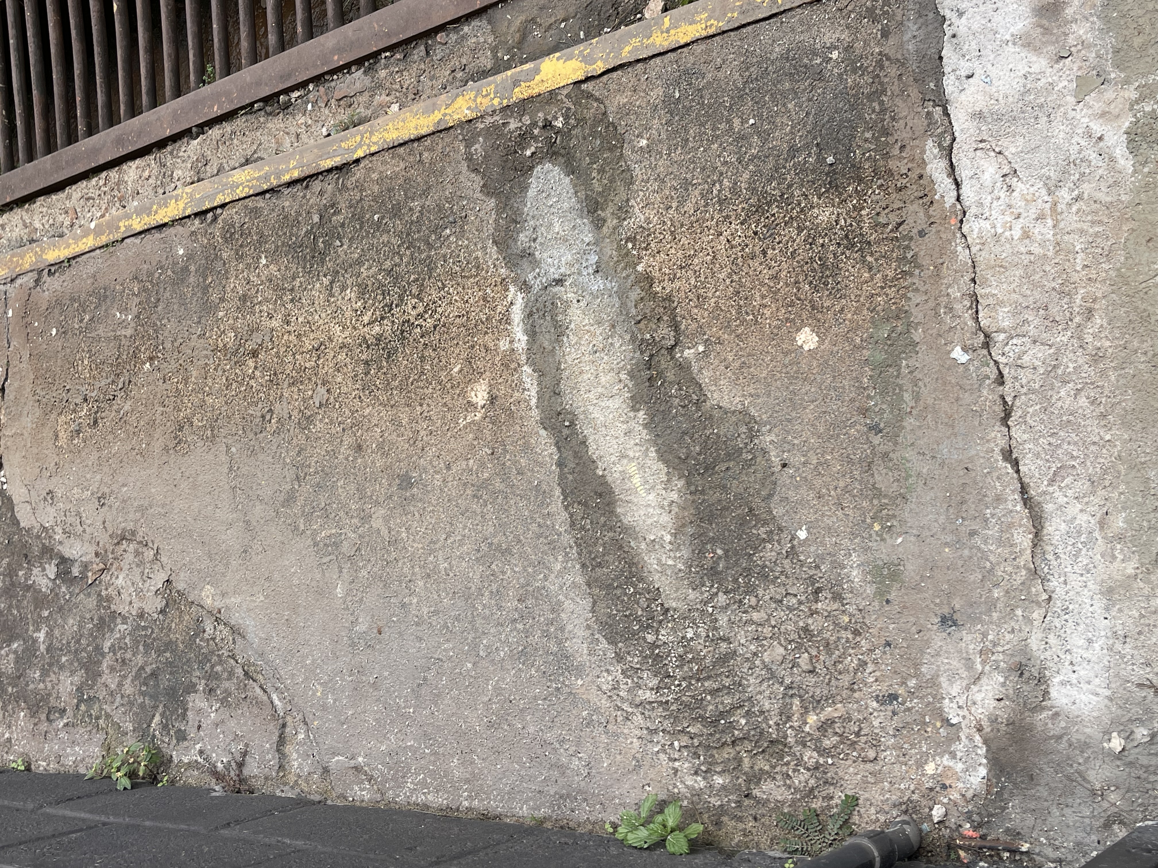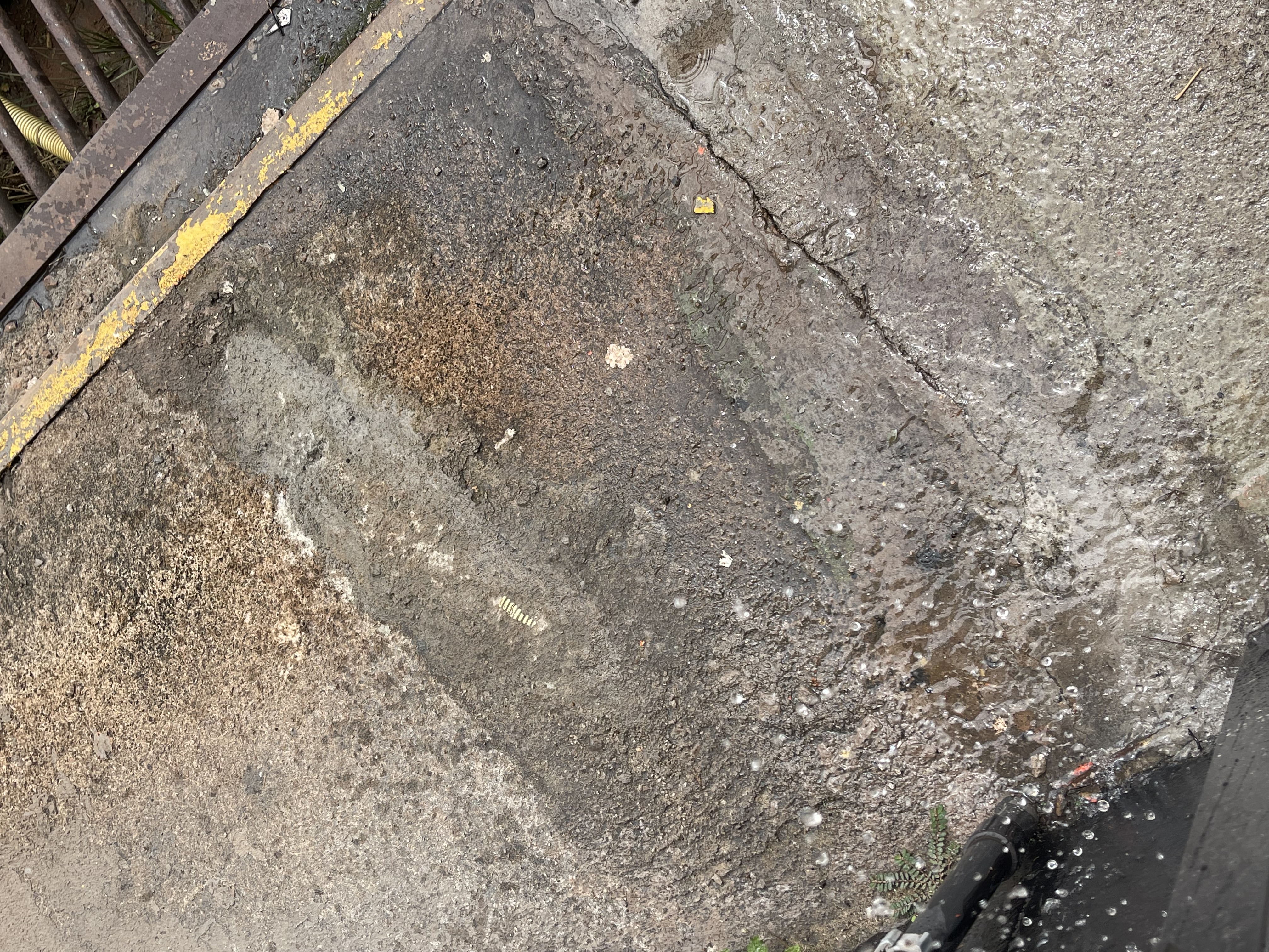 Vazamento de água no chão na entrada do canteiro de obra, levando a pessoa escorregar.